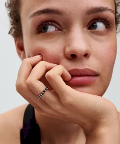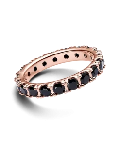 Indulge in timeless elegance with the Black Sparkling Row Eternity Ring from Pandora. Crafted in sterling silver and plated with 14k rose gold, this ring features 19 black man-made crystals. The eternity row design allows the sides of the stones to peek through, offering a modern twist. Functional holes on the inside of the band add versatility. Embrace new stacking possibilities with a balance of modern aesthetics and classic charm with this Pandora Timeless piece.