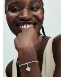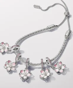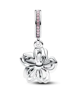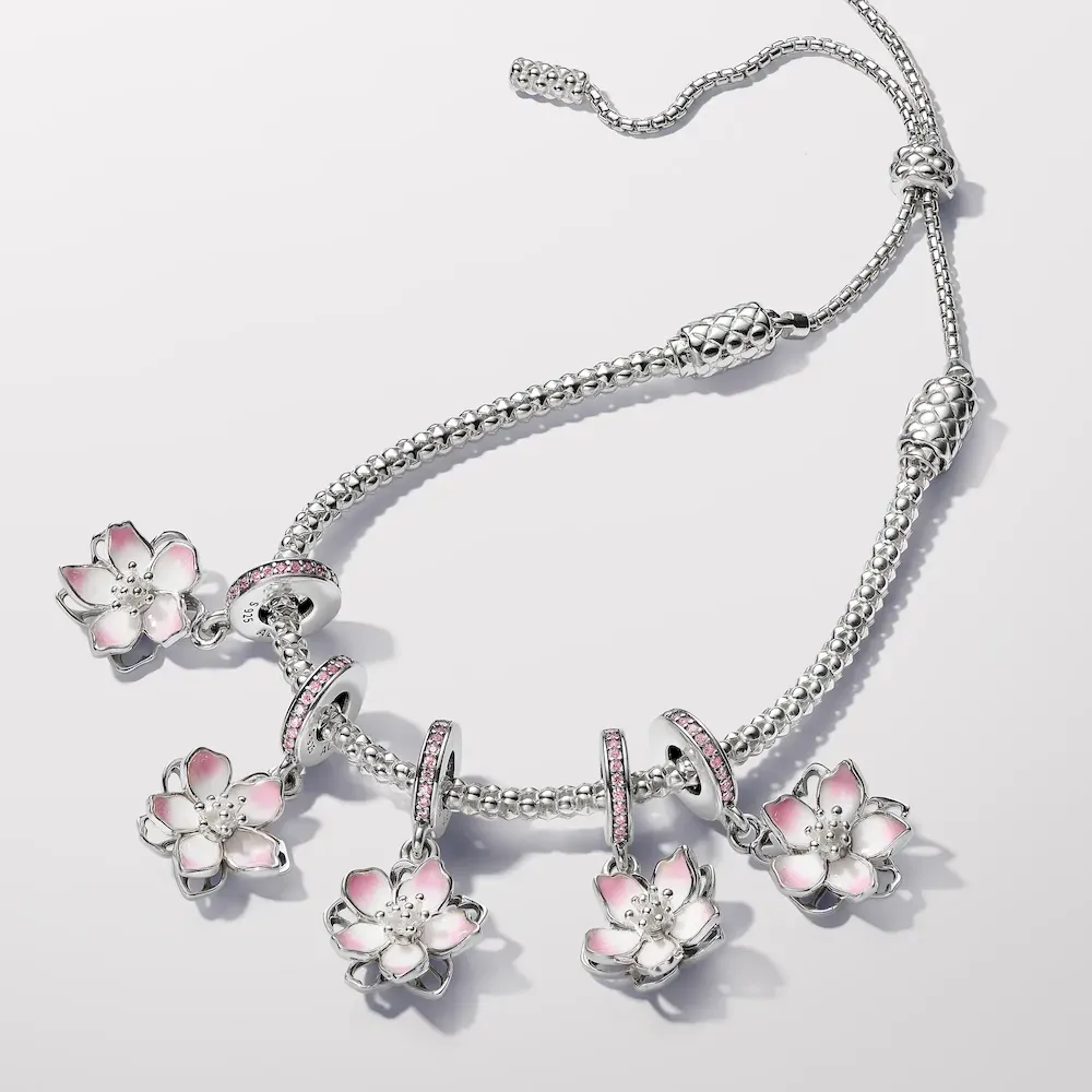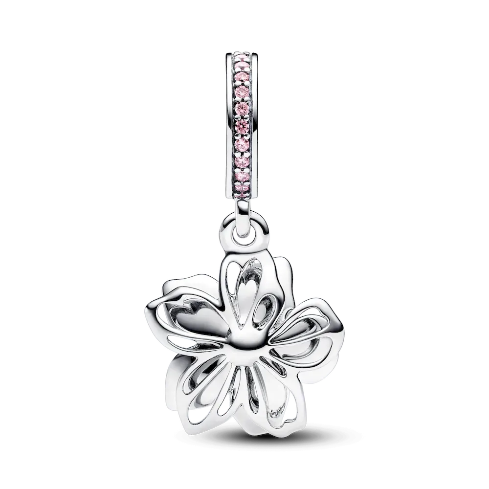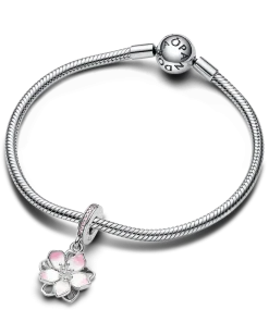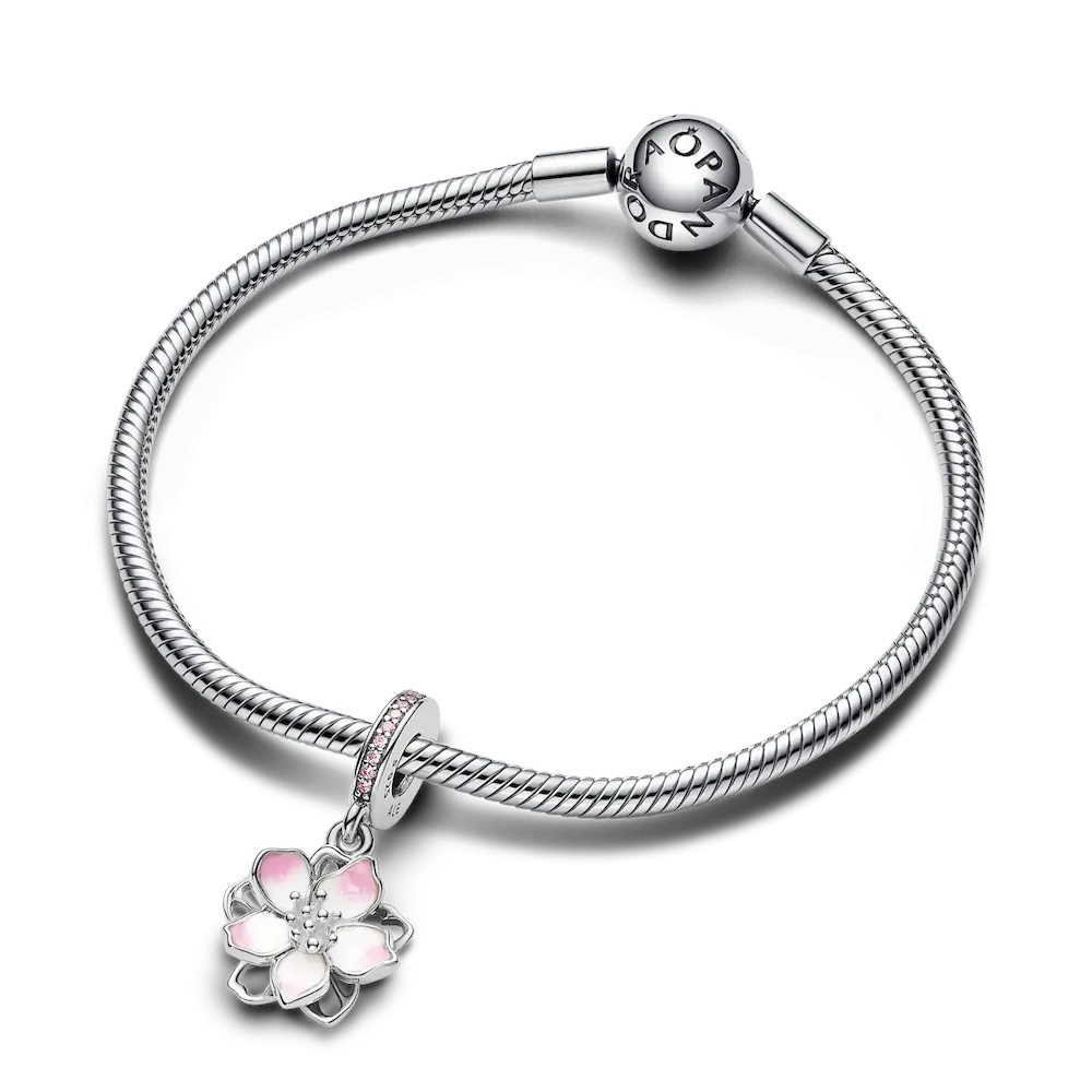 Celebrate the first signs of spring with our sterling silver Cherry Blossom Dangle Charm. Featuring hand-applied pink and white enamel and accented by sparkling pink cubic zirconia, the petals on our cherry blossom rotate slightly, as if they were being blown in the breeze. A pavé-covered bail is the finishing touch on this must-have floral charm. Style it with other cool-toned jewelry for a warm spring look.