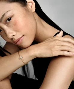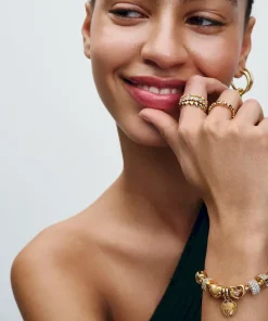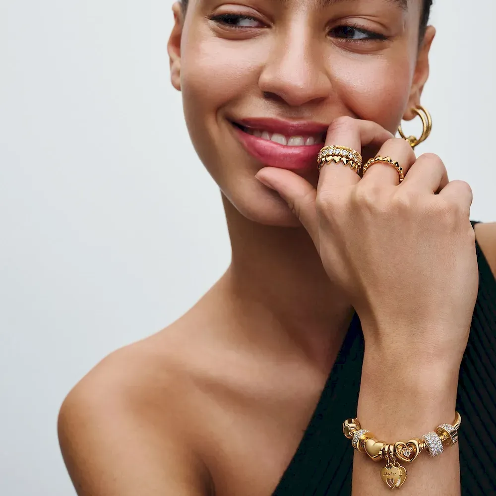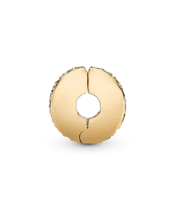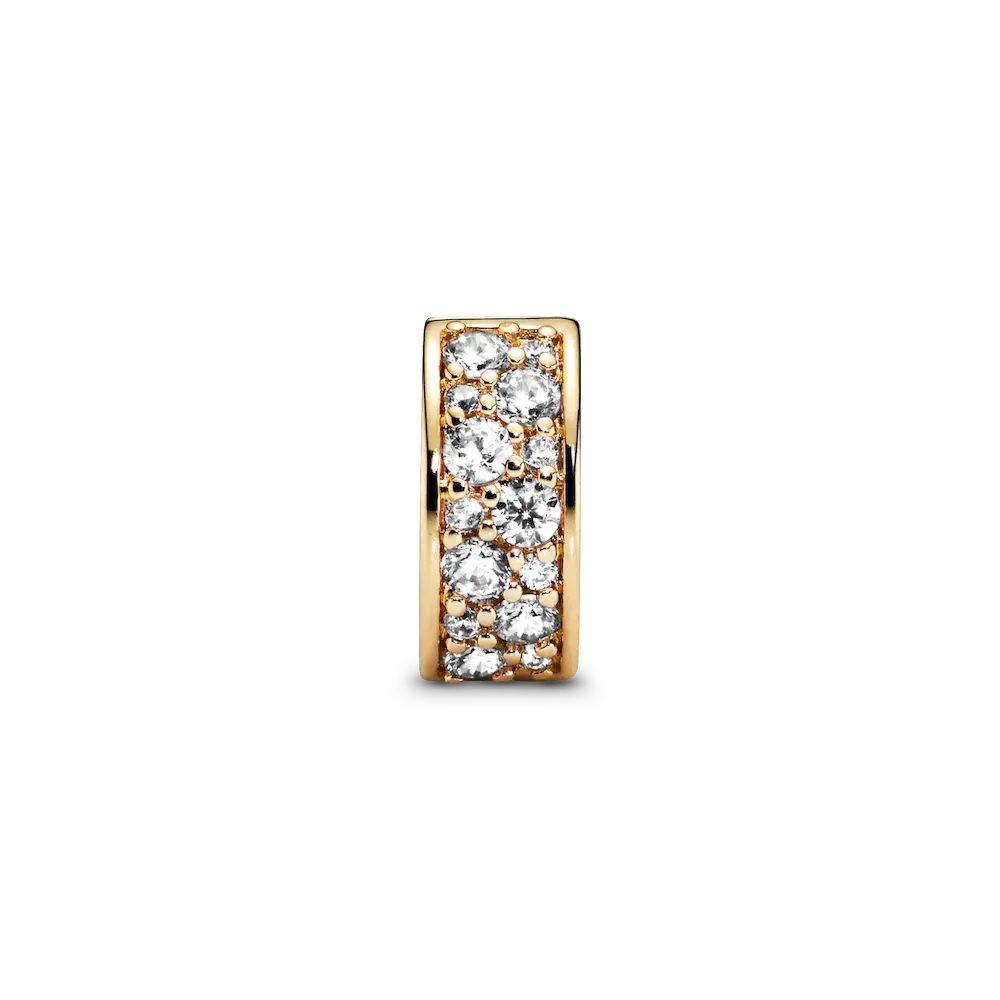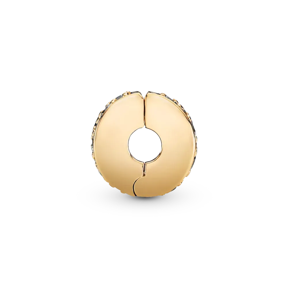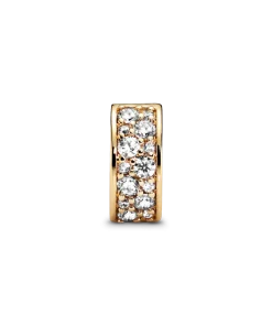 Sparkling clear stones create a striking contrast and an inner silicone grip ensures this Clear Pavé Clip Charm stays exactly where you want it. Wear this 14k gold-plated piece with contrasting metals for a modern look. This clip charm features a silicone grip and does not fit onto threads (two raised charm dividers). This charm can be styled anywhere else on the bracelet.