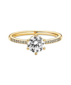 Tap into shining elegance with the Clear Sparkling Crown Solitaire Ring. This solitaire ring, hand-finished in 14k gold-plated metal, features a large clear cubic zirconia center stone set in a crown-shaped claw setting. The setting, as well as the ring shank, are embellished with clear cubic zirconia stones, making the ring shine even brighter. Inspired by the look of a regal crown, this ring will bring a royal touch to any outfit.