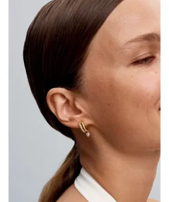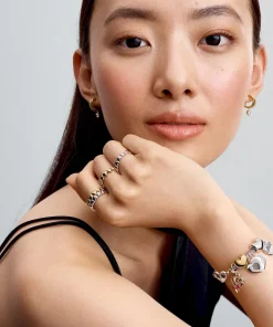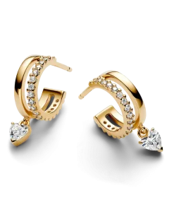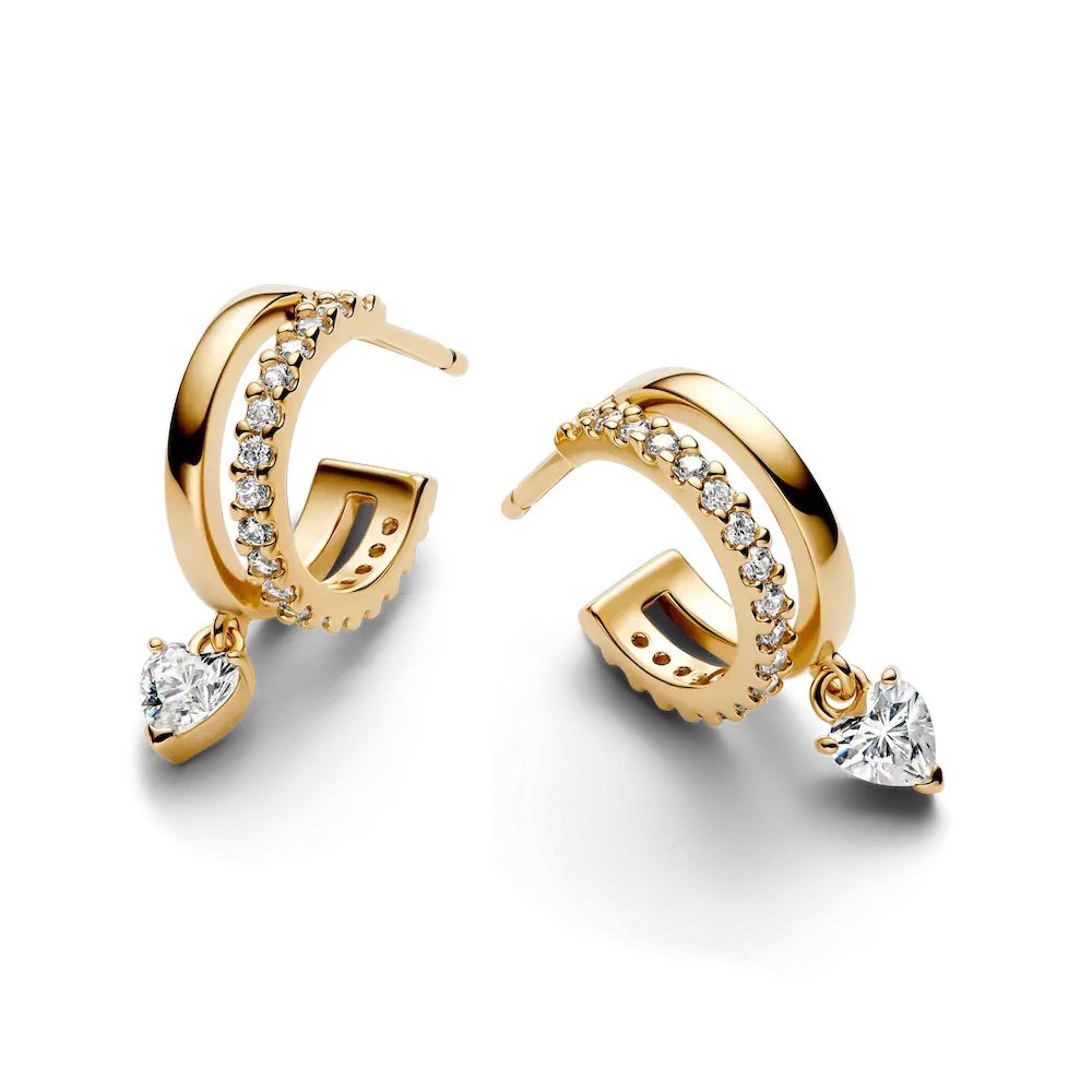 Give your style a little love with our Pandora Timeless Dangling Heart Hoop Earrings. Finished in 14k gold plating, these earrings feature one polished band and one cubic zirconia encrusted band. Each double hoop designs ends with a heart-shaped cubic zirconia hanging below. A butterfly back guarantees comfort and security. Wear as a modern twist on a classic silhouette.