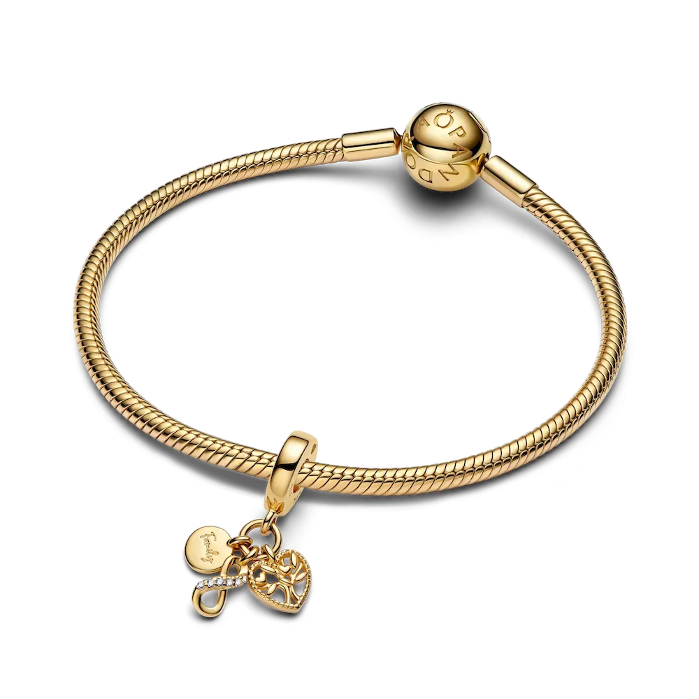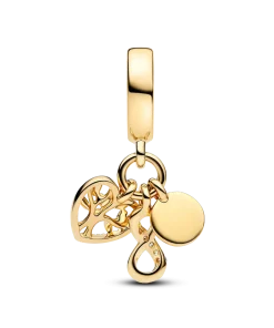 Celebrate the beauty of family with our 14k gold-plated triple dangle charm. Featuring a family tree in a heart, an infinity symbol and a ‘family’ engraving, it’s a symbol of shared love and unity.