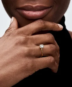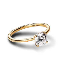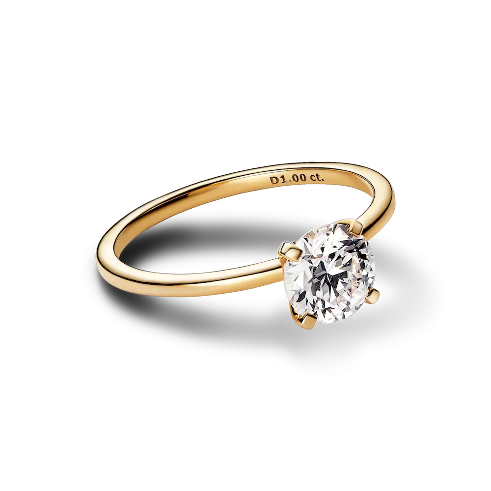 A fresh twist on a classic. The Pandora Era 14k Gold Lab-grown Diamond Ring showcases a 1.00 carat round brilliant excellent cut lab-created diamond in a four-prong setting that combines round and flat profiles, creating a modern aesthetic and opening the stone to the light for amplified sparkle. This eye-catching 14k gold ring is a piece to be worn and treasured for years to come – by you or someone who brings light into your world. Each Pandora Lab-grown diamond is treated with a post-growth color enhancement called annealing.